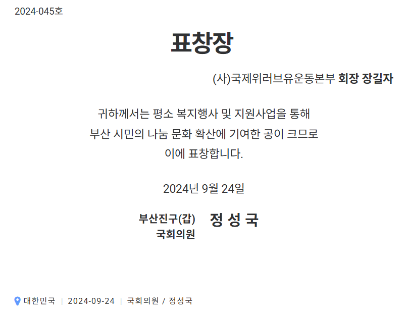 국회의원 표창장 - 국제위러브유운동본부(회장 장길자) 본문