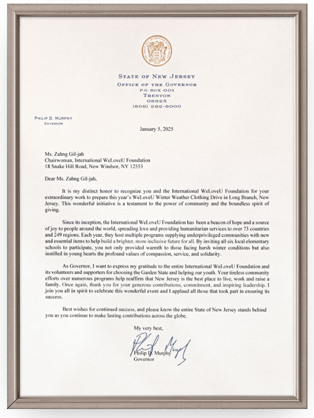 올해 뉴저지주 롱브랜치에서 열린 위러브유 겨울의류 기부운동을 준비해 주신 귀하와 국제위러브유의 특별한 노력을 표창하게 되어 정말 영광입니다. 이 놀라운 활동은 지역사회의 힘과 무한한 기부 정신을 보여주는 증거입니다.