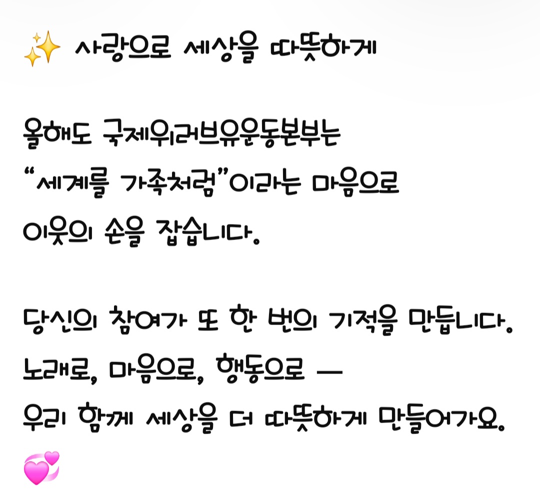 [뉴스웍스=박광하 기자] 글로벌 NGO 국제위러브유가 '어머니의 사랑을 온 세상에'라는 슬로건 아래 국내 기후위기 취약계층, 네팔·필리핀·몽골 등 해외 10개 기후재난국, 몽골 희귀난치성질환 어