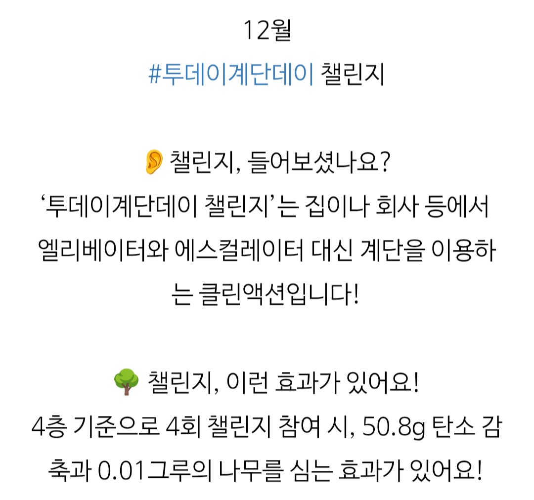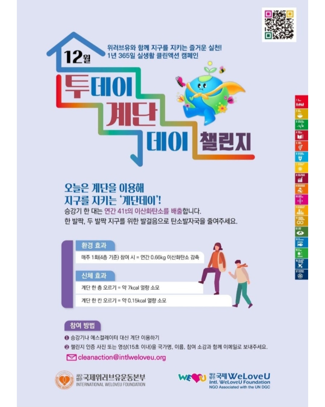 국제위러브유(회장 장길자)가 12월 한 달 동안 '투데이계단데이 챌린지'를 펼쳤습니다. 엘리베이터나 에스컬레이터 대신 계단을 이용하며 기후 위기에 대응했습니다. 이 챌린지는 특별한 기구나