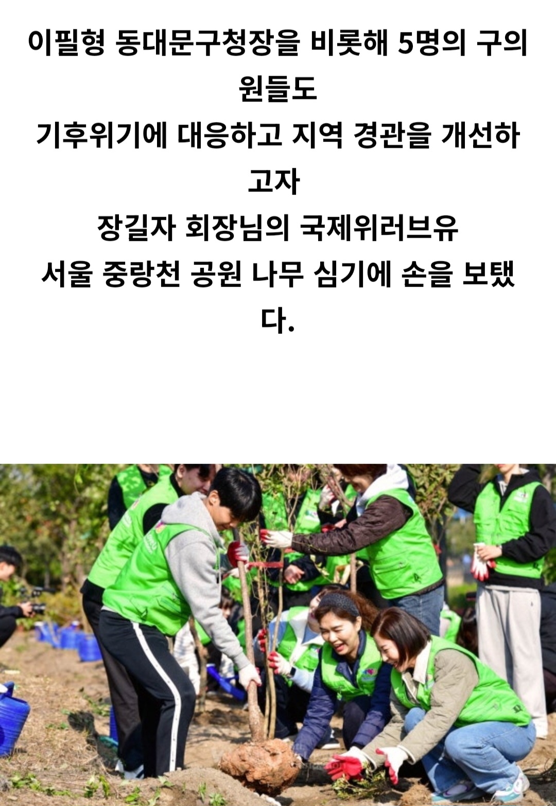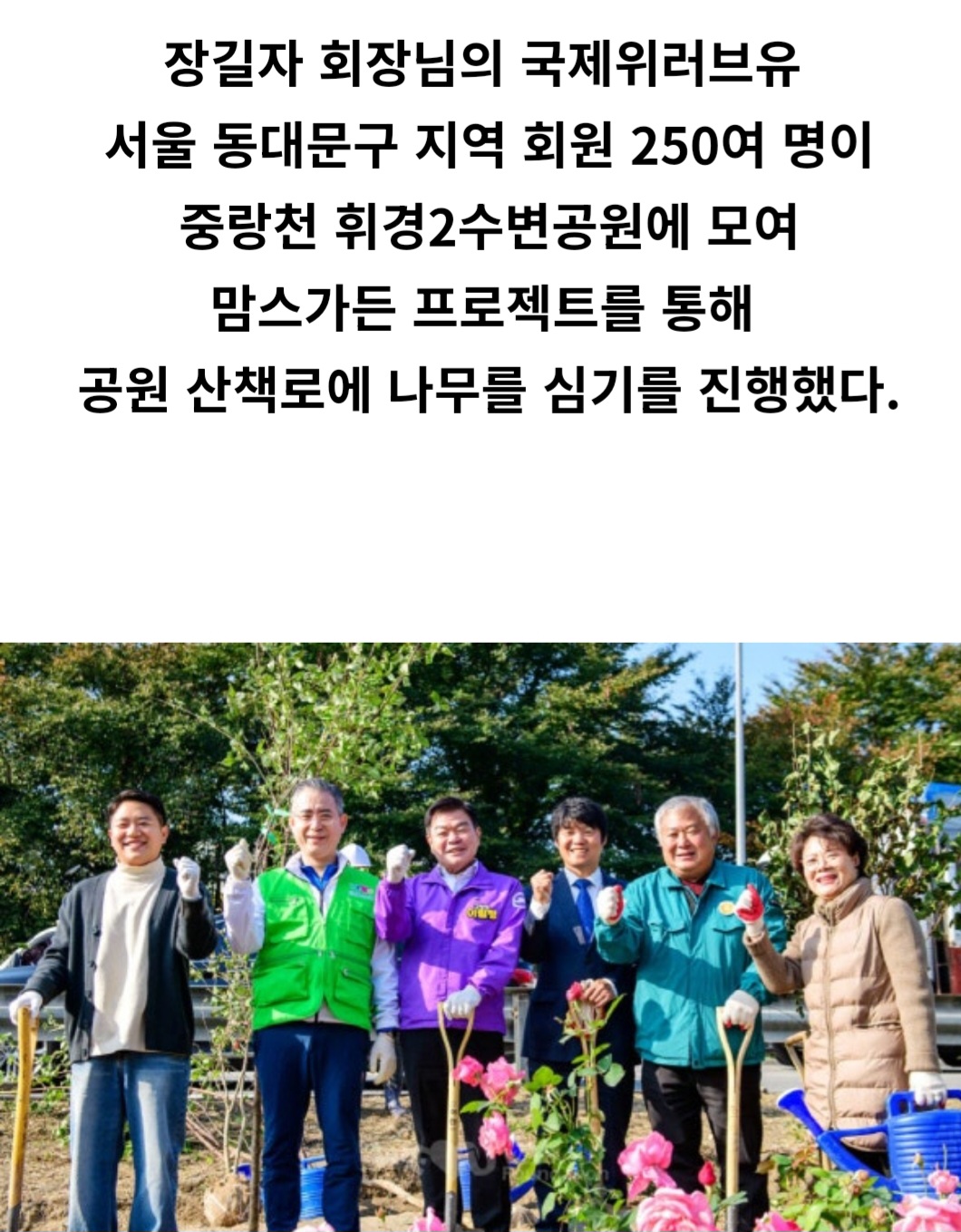 국제위러브유(회장 장길자) 서울 동대문구 지역 회원 250여 명이10월 29일, 위러브유 중랑천 휘경2수변공원에서 맘스가든 프로젝트를 통해 공원 산책로에 산수유, 라일락, 영산홍 827그루를 심었습