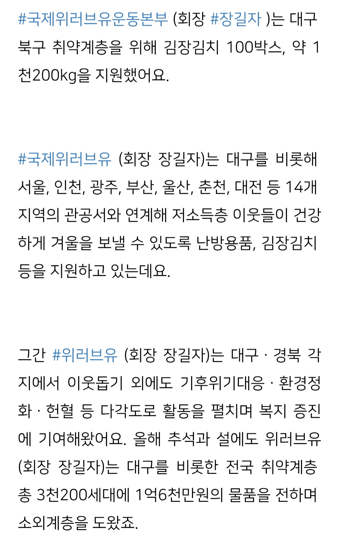 국제위러브유운동본부는 대구 북구 취약계층을 위해 김장김치 100박스, 약 1천200kg을 지원했다.위러브유는 대구를 비롯해 서울, 인천, 광주, 부산, 울산, 춘